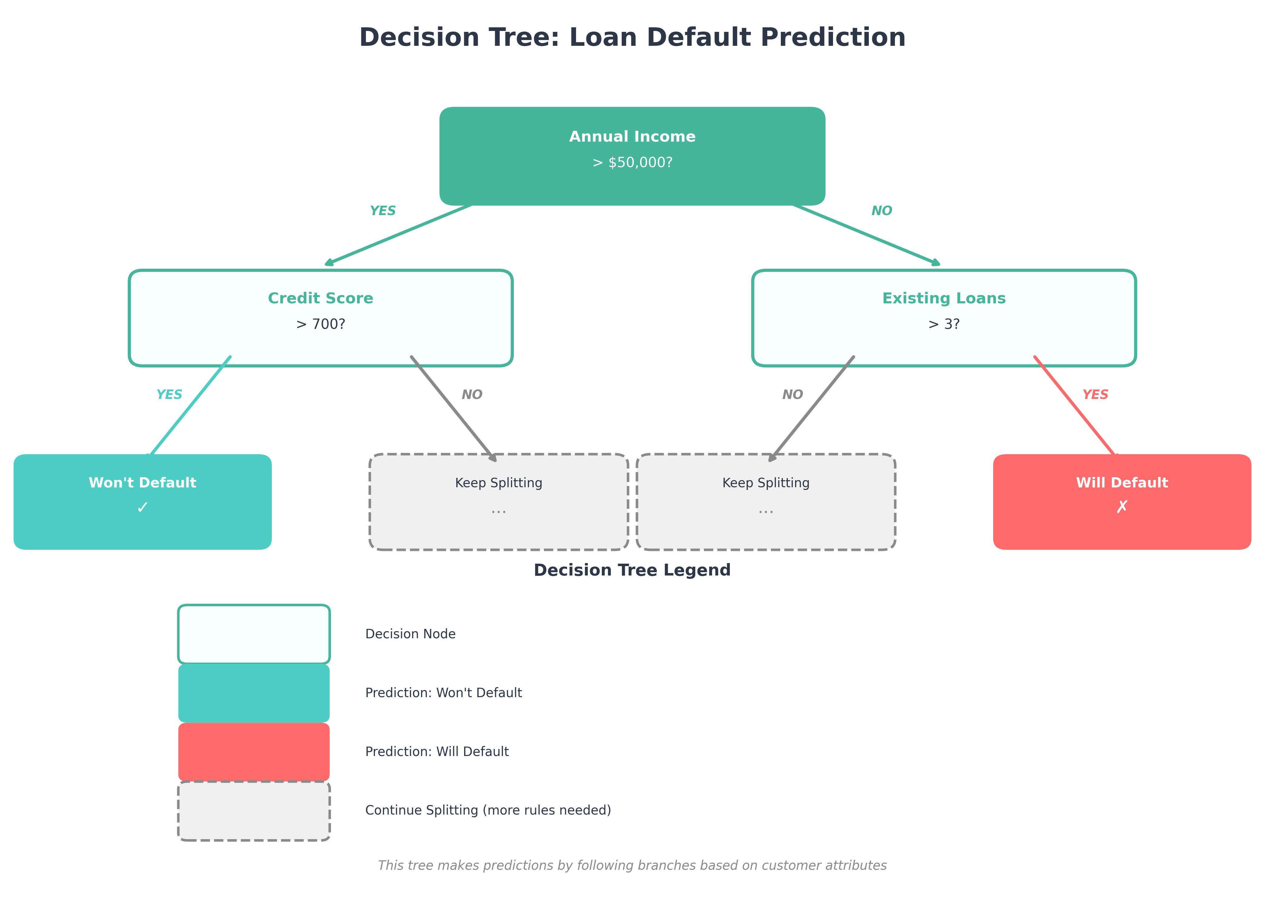 This continues until the tree reaches a prediction for every possible combination of features. Each path through the tree represents a simple rule: "IF income > $50k AND credit_score > 700 AND existing_loans < 3 THEN low_risk."